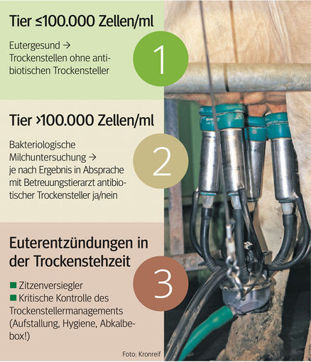 Bei Tieren mit einer Zellzahl >100.000 Zellen/ml sollte unbedingt vor dem Trockenstellen eine bakteriologische Milchuntersuchung eingeschickt werden, um festzustellen, ob es sich um ein infiziertes Euter handelt. Je nachdem, was dabei herauskommt (Erreger ja/nein), sollte mit dem Betreuungstierarzt besprochen werden, ob diese Kuh antibiotisch trockengestellt werden soll oder nicht. Auch wenn kein Erreger nachgewiesen werden kann, kann es, v. a. in der "Anfangsphase" des selektiven Trockenstellens, trotzdem empfehlenswert sein, antibiotische Trockensteller zu verwenden.