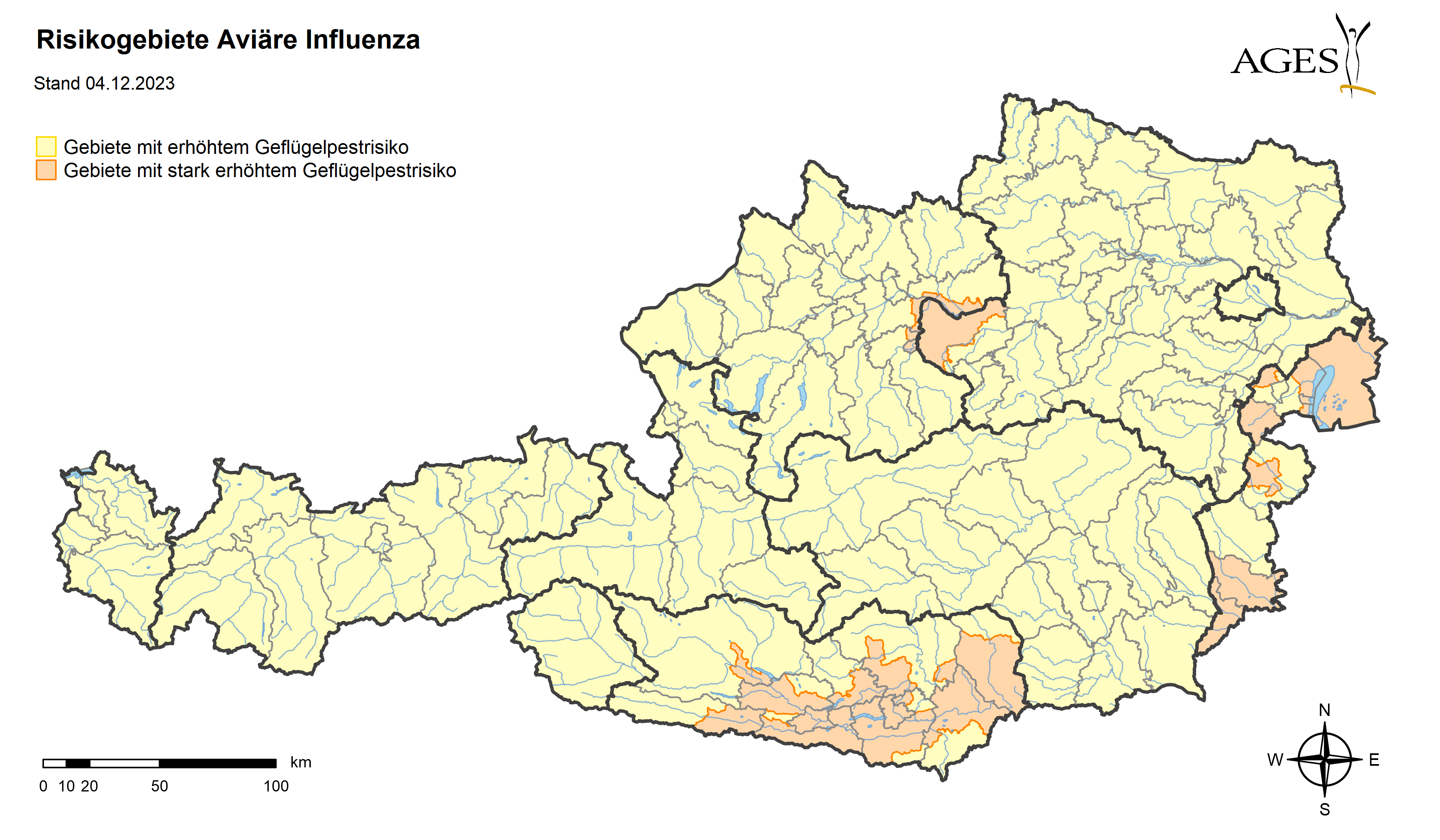 Mit 5. Dezember 2023 war aufgrund von vermehrten Vogelgrippeausbrüchen bei Wildvögeln in stark erhöhten Risikogebieten die Stallpflicht eingeführt worden. Die Geflügelhalter werden gebeten, die Sicherheitsmaßnahmen strikt einzuhalten.