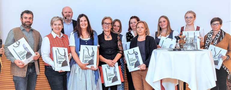 Die Obfrauen Petra Pobaschnig vom Landesverband bäuerlicher Direktvermarkter und vom Genussland Kärnten Barbara Wakonig, Direktorin Ing. Waltraud Stroj von der LFS Ehrental, Ing. Karl Heinz Huber, Leiter Bildungshaus Schloss Krastowitz, Florian Blumberg, Agentur Blumberg. Gesponsert wurden Joghurts von der Berglandmilch bzw. Obmann Thomas Jordan und Äpfel vom Obst- und Weinbauzentrum St. Andrä.