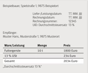 Wenn pauschalierte Betriebe eine Rechnung an Unternehmen ausstellen, muss der Vermerk "Durchschnittssteuersatz 13%" angeführt werden.
