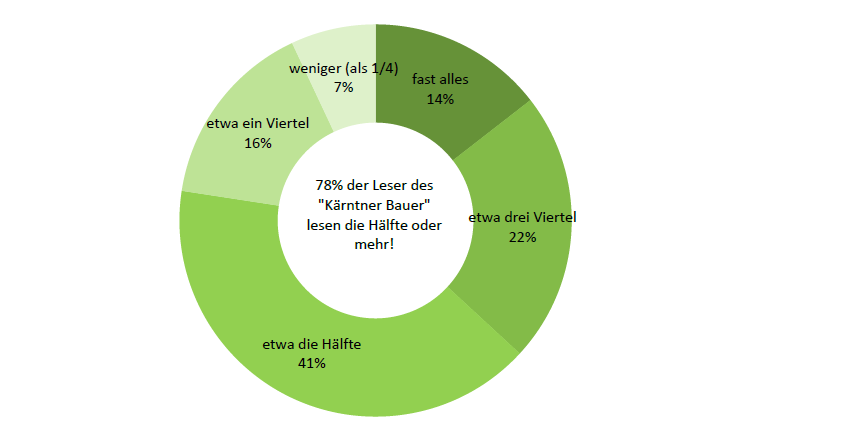 Die Leseintensität (Frage 3) zeigt, dass 78 % die Hälfte oder mehr einer Ausgabe des „Kärntner Bauer“ lesen. Die größte Gruppe liest „etwa die Hälfte“ (41 %), 22 % rund „etwa drei Viertel“ und 14 % „fast alles“.