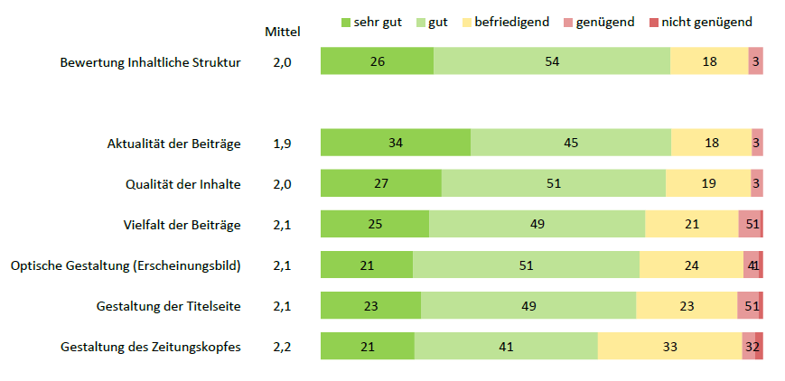 Frage 5 nahm die Zufriedenheit mit Inhalt, Qualität, Struktur, optischer Aufmachung unter die Lupe; Verbesserungsvorschläge waren willkommen. Die „Aktualität der Beiträge“ schneidet hier am besten ab (Notendurchschnitt 1,9). Hernach folgen „Qualität der Inhalte“ und „inhaltlichen Struktur“ (jeweils 2,0).