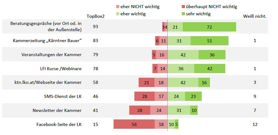 In der Einstufung der Wichtigkeit zeigt sich, dass die persönlichen Beratungsgespräche für die Landwirte von größter Wichtigkeit sind (93 %). Auf Platz 2 folgt der „Kärntner Bauer“ mit 83 % – laut Barbara Mayr ist das ein „Top-Wert“ für das „unpersönliche“ Kammermedium gegenüber den „persönlichen, zwischenmenschlichen“ Beratungsgesprächen. Die Veranstaltungen der Kammer wurden mit 79 % ebenfalls sehr hoch eingestuft. Die Website ktn.lko.at liegt mit 58 % als Nummer 5 im Mittelfeld.