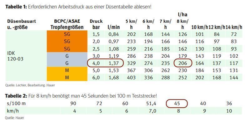 Erforderlichen Spritzdruck aus einer Düsentabelle oder Einstellhilfe auswählen! Für das genannte Beispiel ergibt sich ein Druck von ca. 4 bar (siehe Tabelle 1).