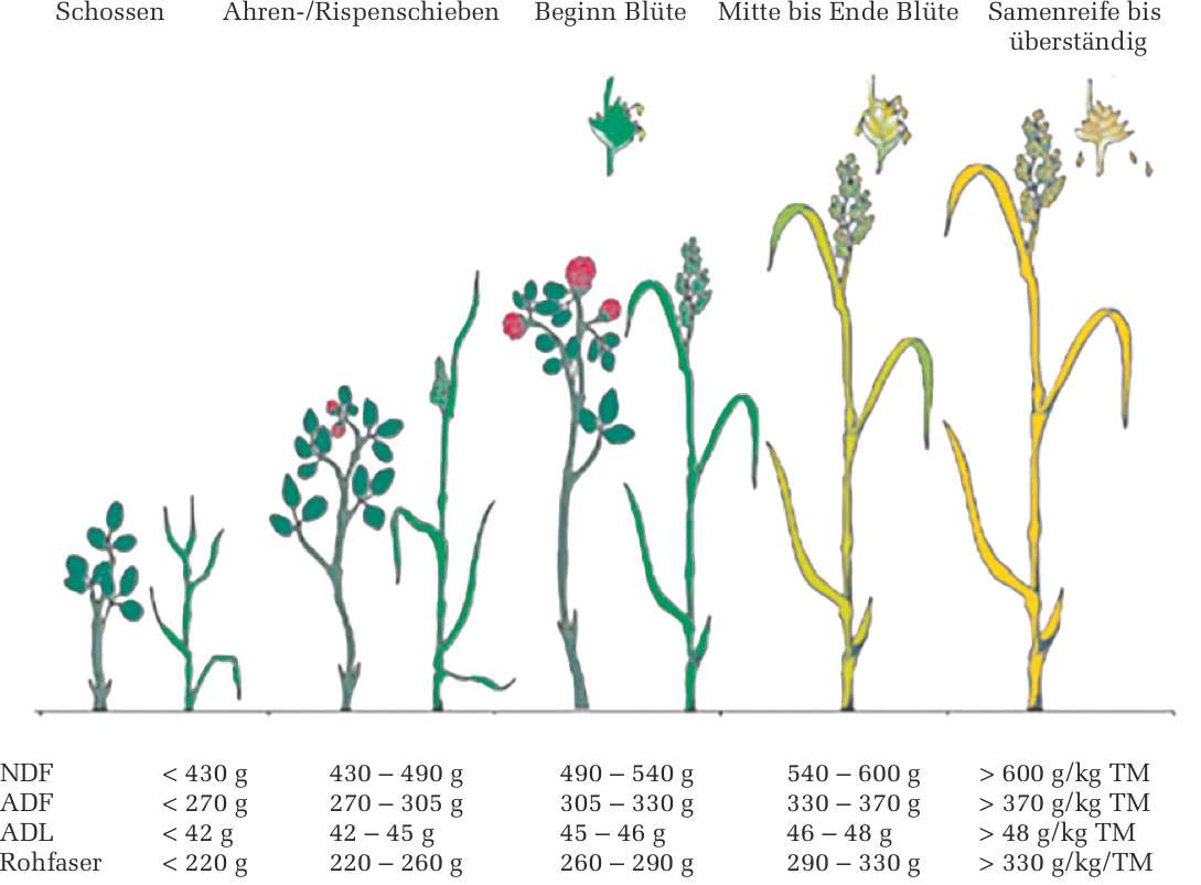 Beim ersten Aufwuchs enthalten Gräser von Beginn an mehr Gerüstsubstanzen (NDF) als Leguminosen und Kräuter, wobei Knaulgras und Wiesenfuchsschwanz höher liegen als z. B. Raygräser. Im Vegetationsverlauf ändert sich der NDF-Gehalt bei Kräutern nur geringfügig, bei Luzerne steigt er jedoch stark an. Weidebestände weisen deutlich geringere NDF-Gehalte und höhere Nutzungs elastizitäten auf als obergrasbetonte Dauerwiesen. Interessanterweise enthalten Knaulgras und Wiesenfuchsschwanz im Vergleich zu anderen Gräsern beim zweiten Aufwuchs nicht mehr NDF. Beim Ligningehalt (ADL) zeigt sich, dass Gräser geringere Werte aufweisen als Kräuter und Leguminosen. Auch die Zunahme im Vegetationsverlauf ist bei Leguminosen deutlich höher als bei Gräsern. Kräuter sind in ihrem ADL-Gehalt zwar höher, die Zunahme im Vegetationsverlauf jedoch geringer. Der Anteil von Lignin an der NDF ist bei Leguminosen mit etwa 22% deutlich höher als bei Gräsern mit ca. 8%.