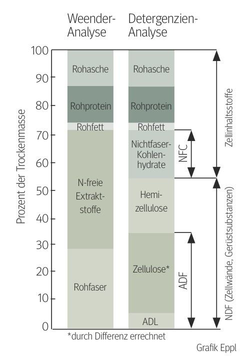 • NDF = Summe der Gerüstsubstanzen (Hemizellulose, Zellulose, Lignin)